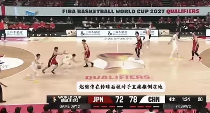 第二节2分50秒,日本后卫富坚勇树冲破,赵继伟下手切球,裁判判罚赵继伟犯规,慢当作深切,这个球整个打到了球,错判。此时赵继伟三犯被换下场。